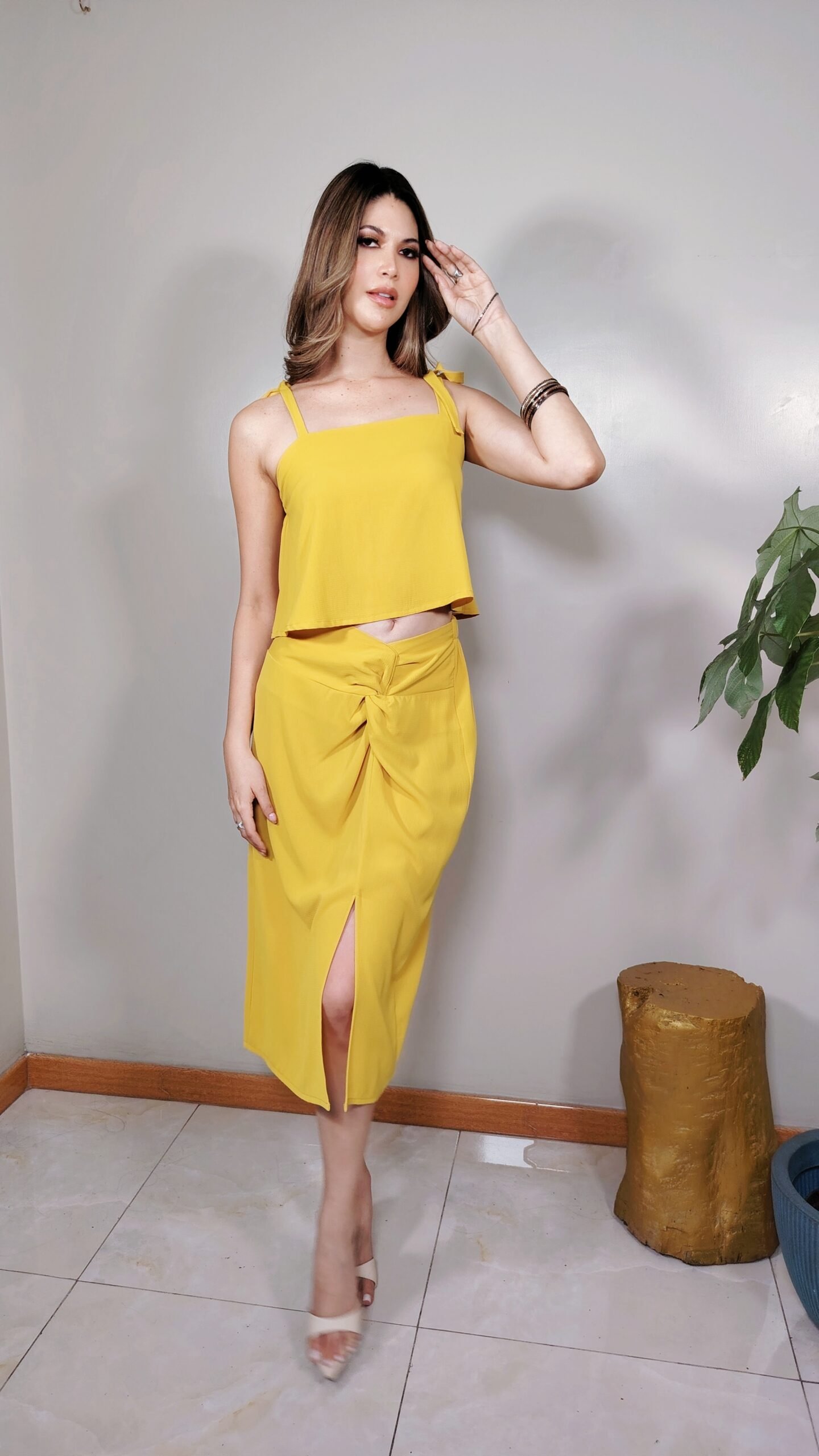 Set mostaza, blusa crop amplia + falda entorchada.