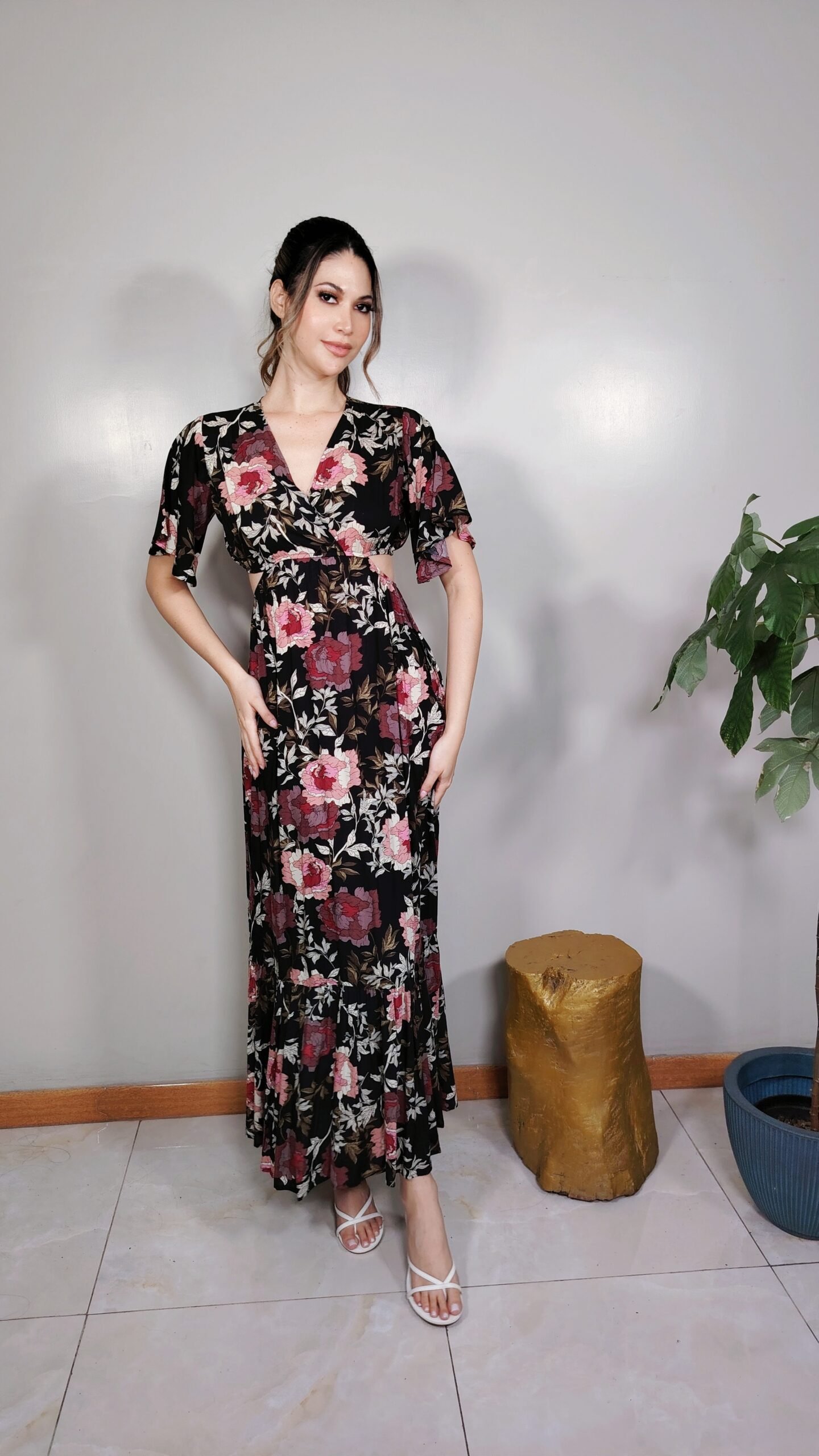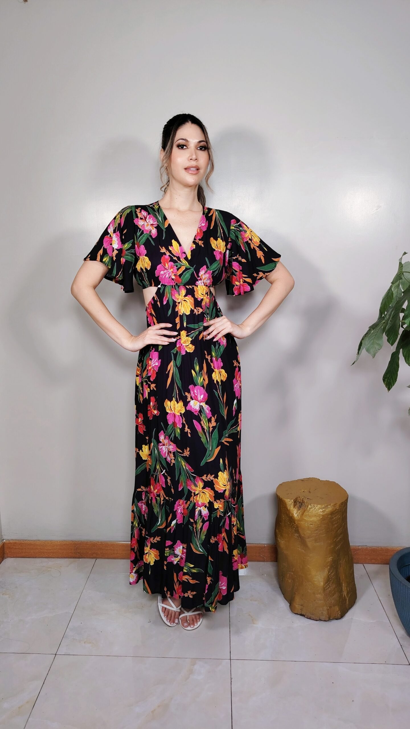 Con su escote cruzado y diseño cut out, realza tu silueta de forma sutil. La falda larga con arandel amplio le da movimiento y elegancia al caminar, mientras que las mangas cortas equilibran el diseño con un toque delicado.