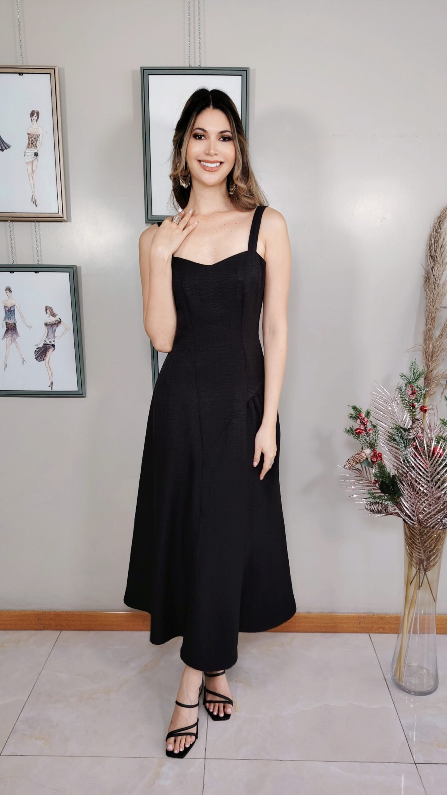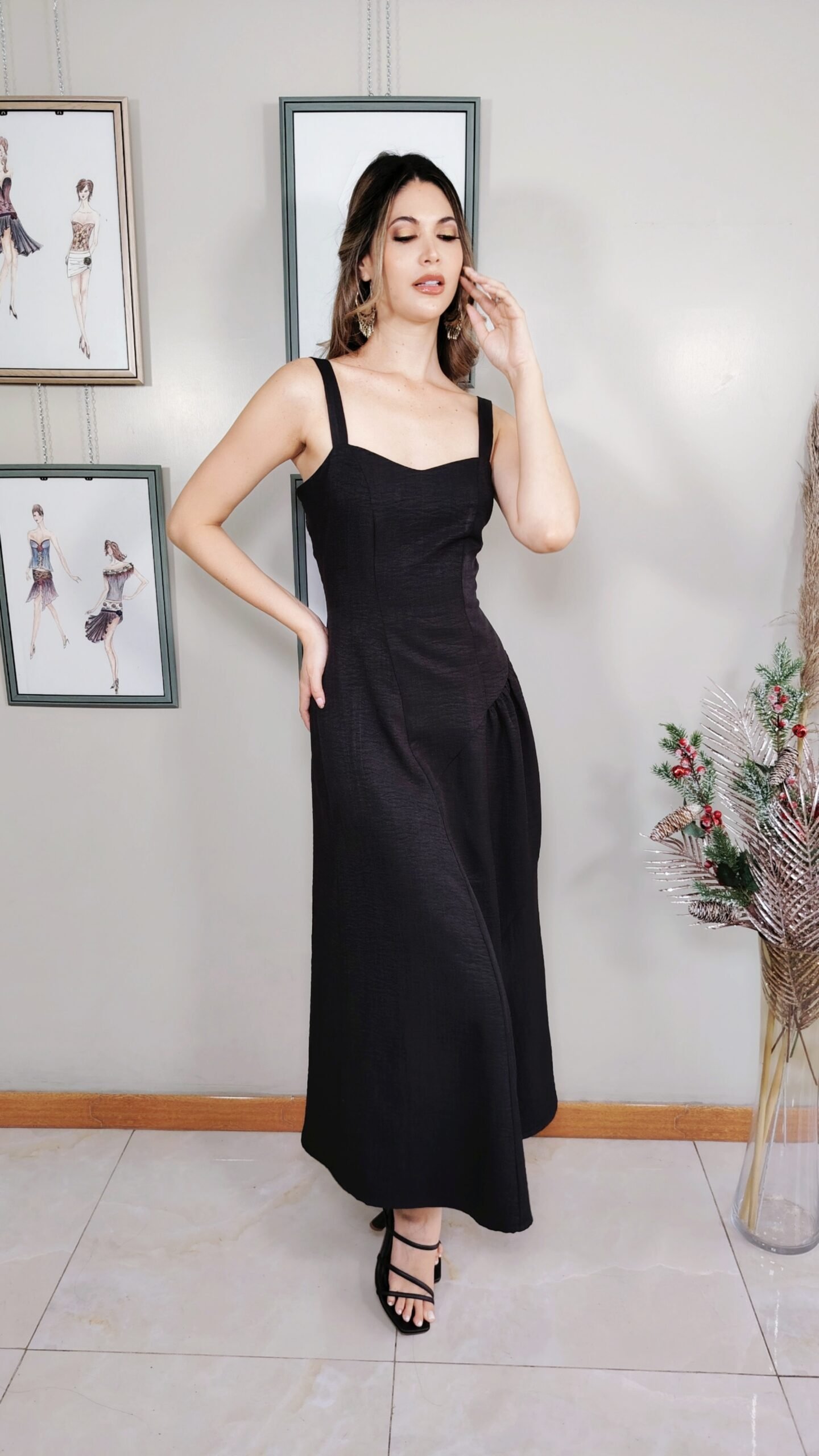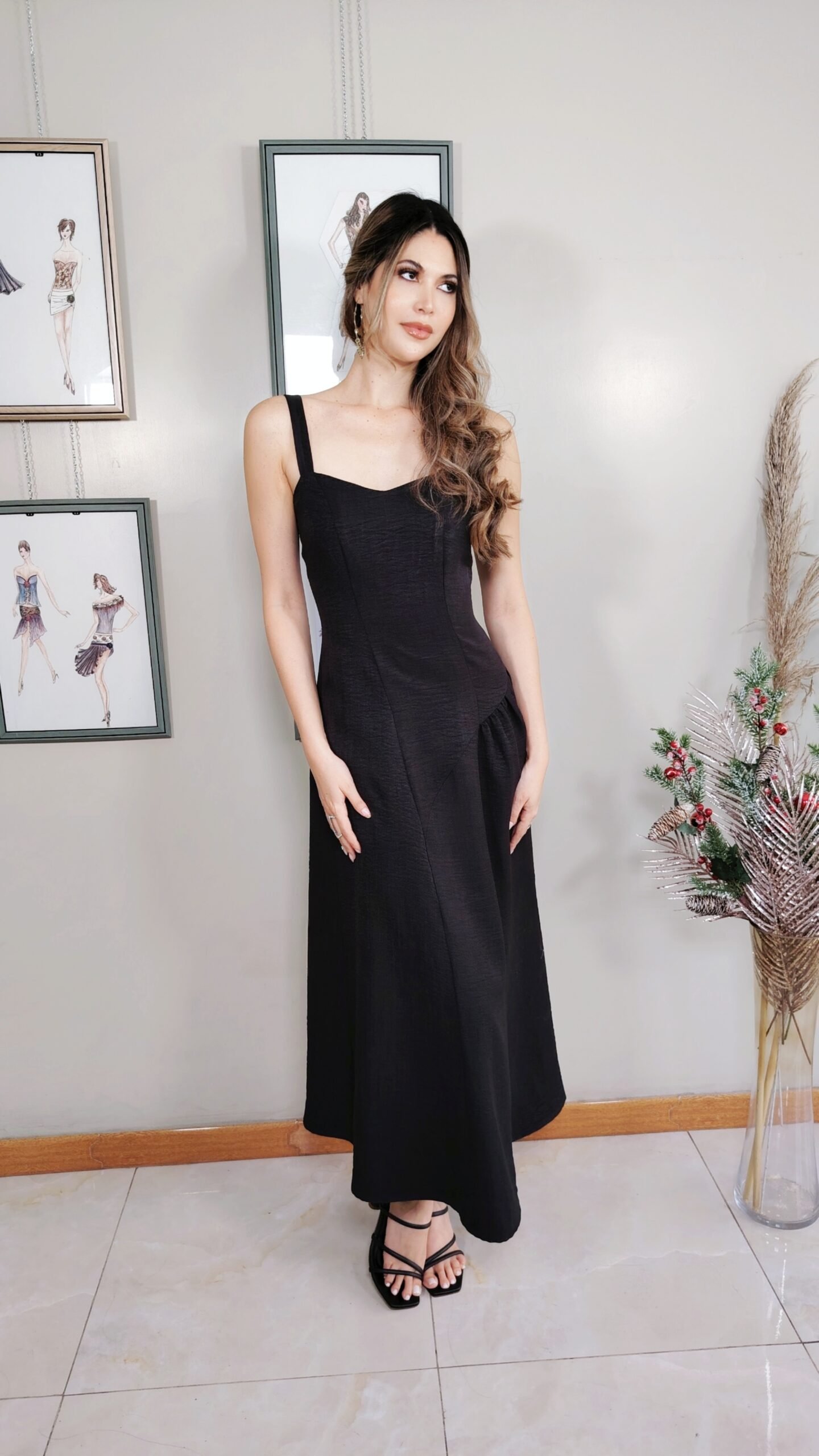 El poder del negro en su mejor versión. Escote palabra de honor con tirantes anchos que favorecen, confeccionado en lino-poliéster que cae con elegancia natural. El forro suave interior te garantiza comodidad y seguridad en cada movimiento.