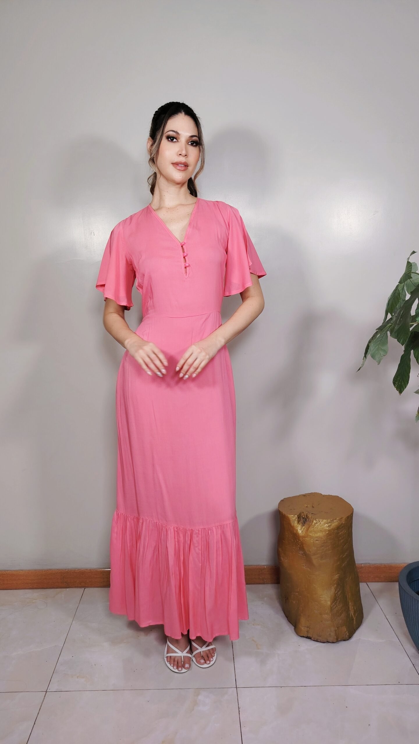 Vestido rosa coral escote V, con mangas tipo vuelo.